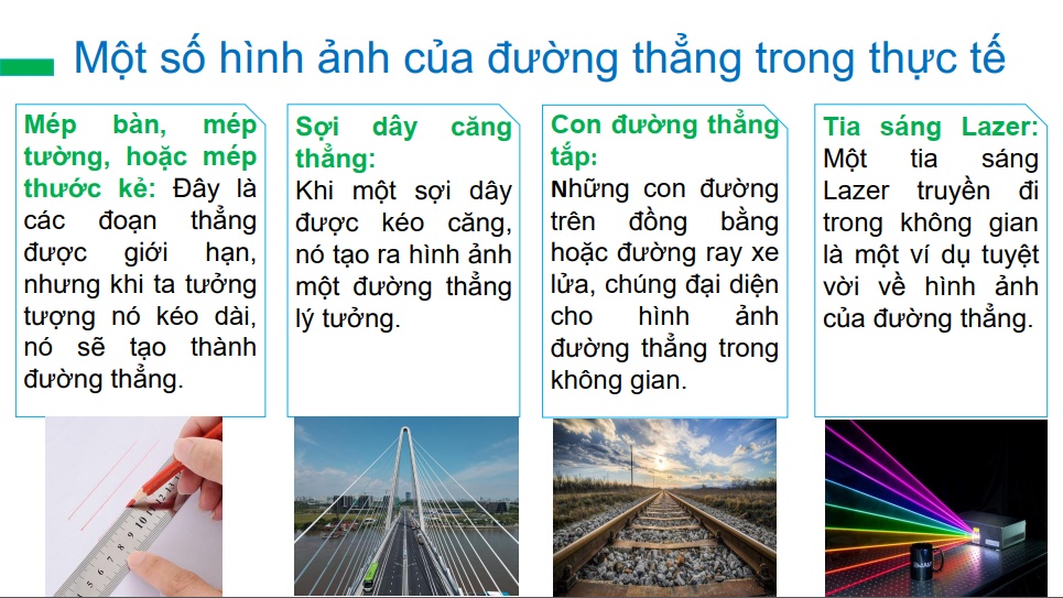 - Vẽ theo mép thước thẳng trên giấy ta được hình ảnh của đường thẳng.